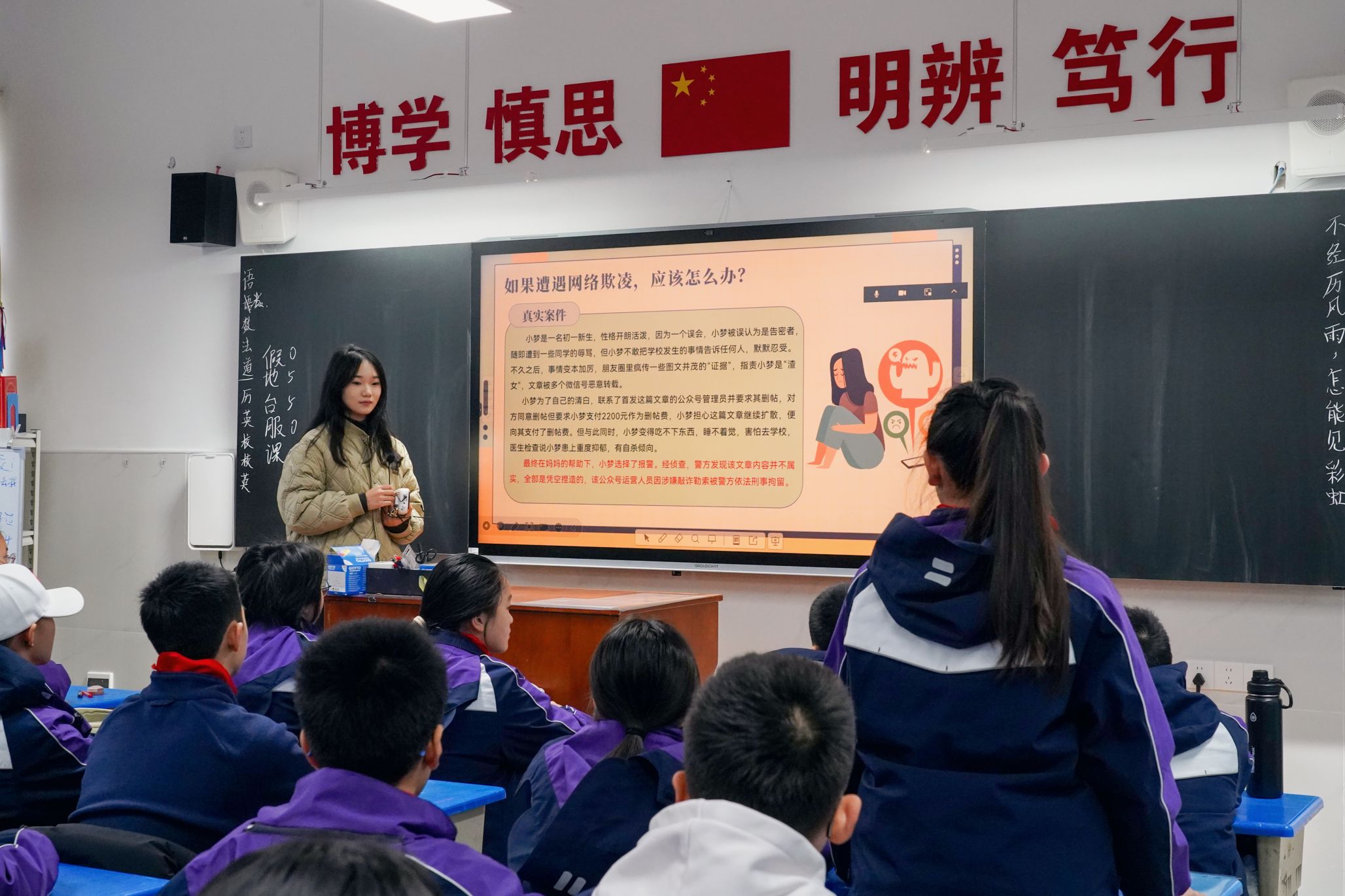 陆梦媛同学说:作为一名法学研究生,我深感荣幸能投身此次研究生进课堂的普法宣传活动,特别是聚焦“网络欺凌”这一关乎未成年人身心健康的重要议题。在宣讲过程中,台下的同学们都很认真地听讲、积极主动地互动。我很开心能看到他们对法律法规的认知更加深入,对网络欺凌的理解更为透彻,同时也掌握了预防和应对网络欺凌的方式。播一粒法治之种,育一方和谐之田。希望这次活动能够让同学们认识到自身在网络环境中的权利与义务,以及如何运用法律武器保护自己免受不法侵害,成为有担当、懂法律的新时代青年,同时我也希望此举能够为思政课改革创新贡献一份力量。