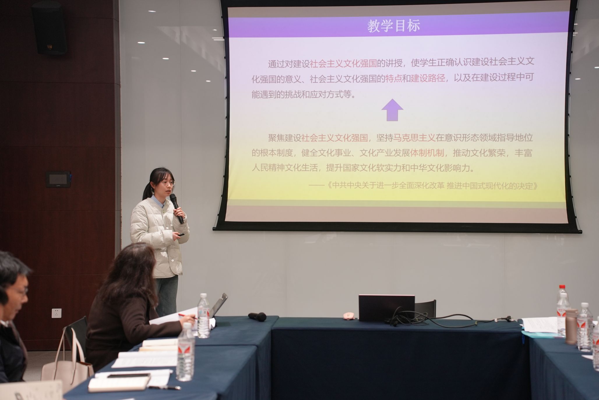 廖新媛老师围绕“建设社会主义文化强国”这一主题开展说课。该课程面向本科二年级学生,基于其已具备的初步文化知识,注重学理性分析,旨在增强学生的使命感和责任感。课程精心设计了八个专题,其中文化专题作为开篇,紧密贴合《习近平文化思想学习纲要》的前沿思想。教学中,廖老师结合教材与《中共中央关于进一步全面深化改革、推进中国式现代化的决定》,设定了明确的教学目标,并通过热门文化现象如“TikTok难民涌入小红书”等案例,引导学生深入探讨建设社会主义文化强国的必要性和紧迫性。课程采用参与式教学方法,通过理论辨析、对比分析及具体措施探讨,帮助学生形成全面认知。课后作业结合时政,如观看《国家宝藏》中云梦睡虎地秦简片段,引导学生关注中华传统文化与文化产业资源,进一步深化理解。