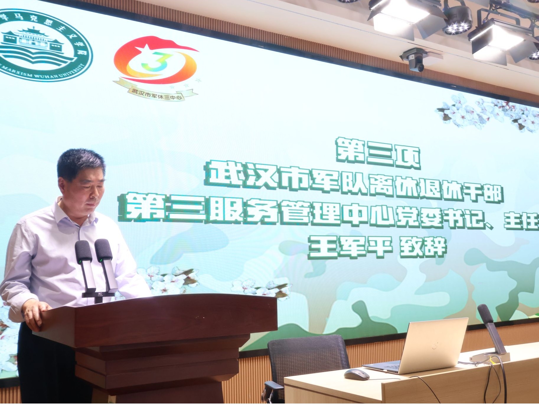 思想政治教育系党支部书记程凌同志与武汉市军队离休退休干部第三服务管理中心党委书记、主任王军平同志分别致辞。