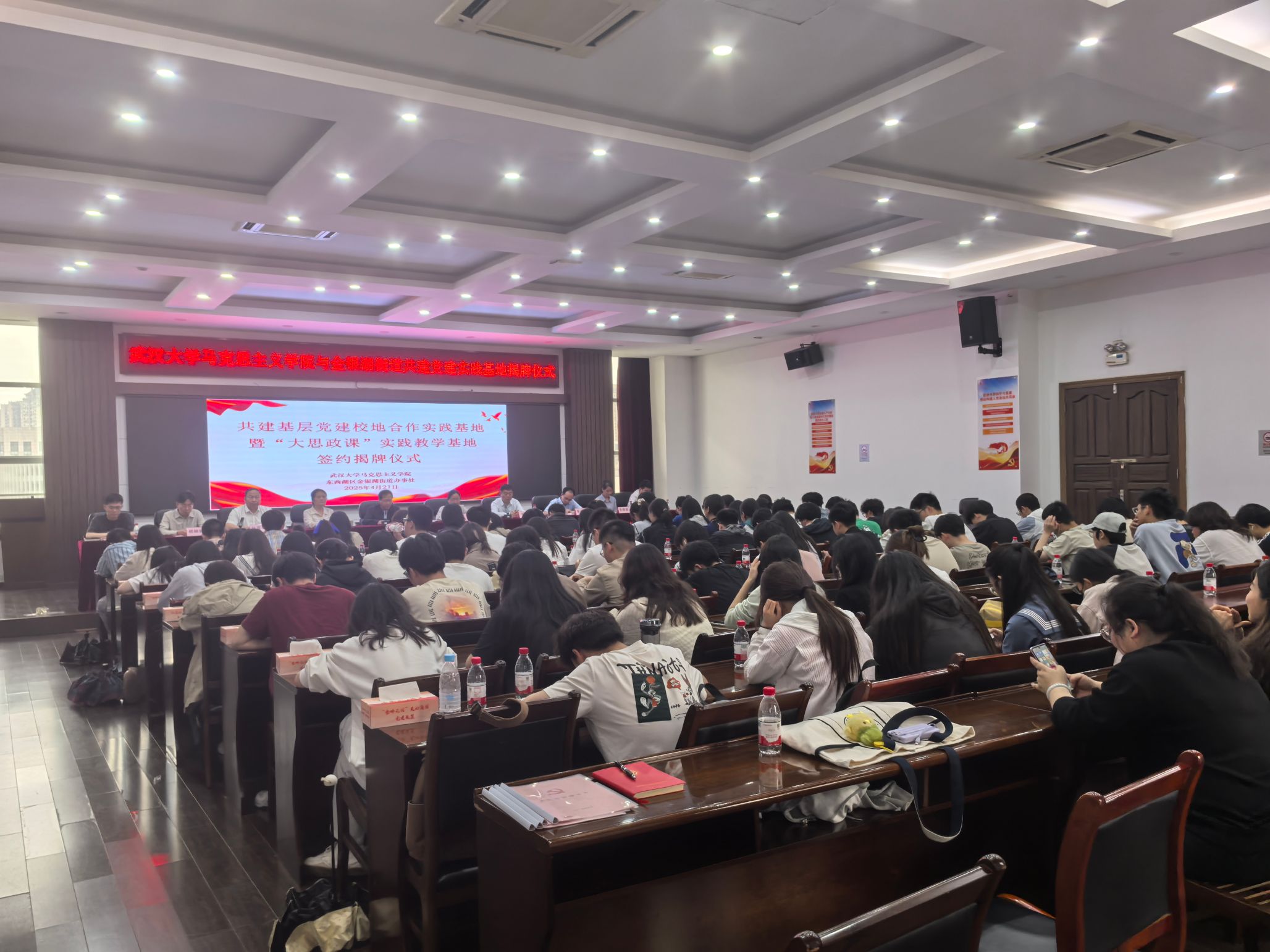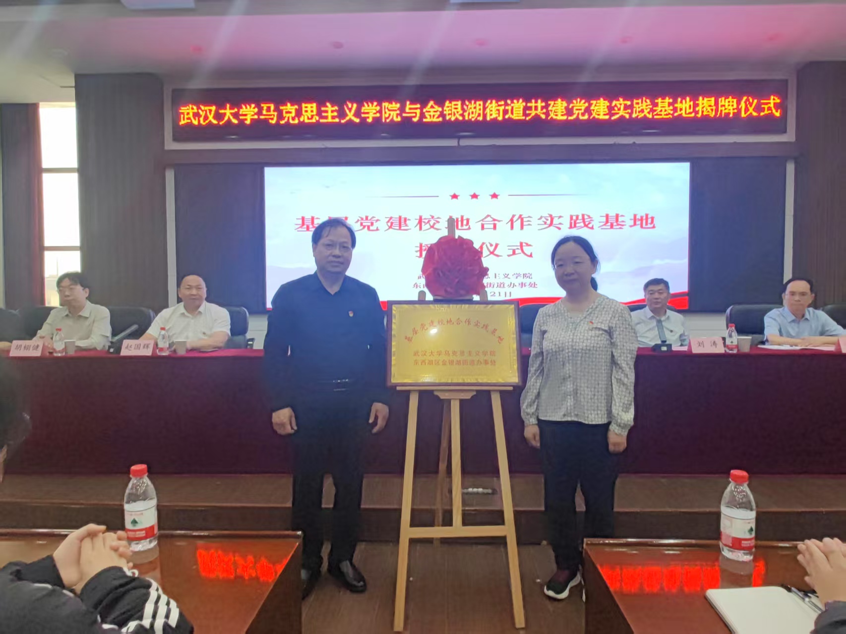 实践教学行程最后,师生们来到金银湖街道办事处701会议室,参加“基层党建校地合作实践基地”揭牌仪式。来自区委组织部、区委直属机关工委等单位的领导参与本次授牌仪式。仪式由街道党工委副书记赵国辉主持,AI风月