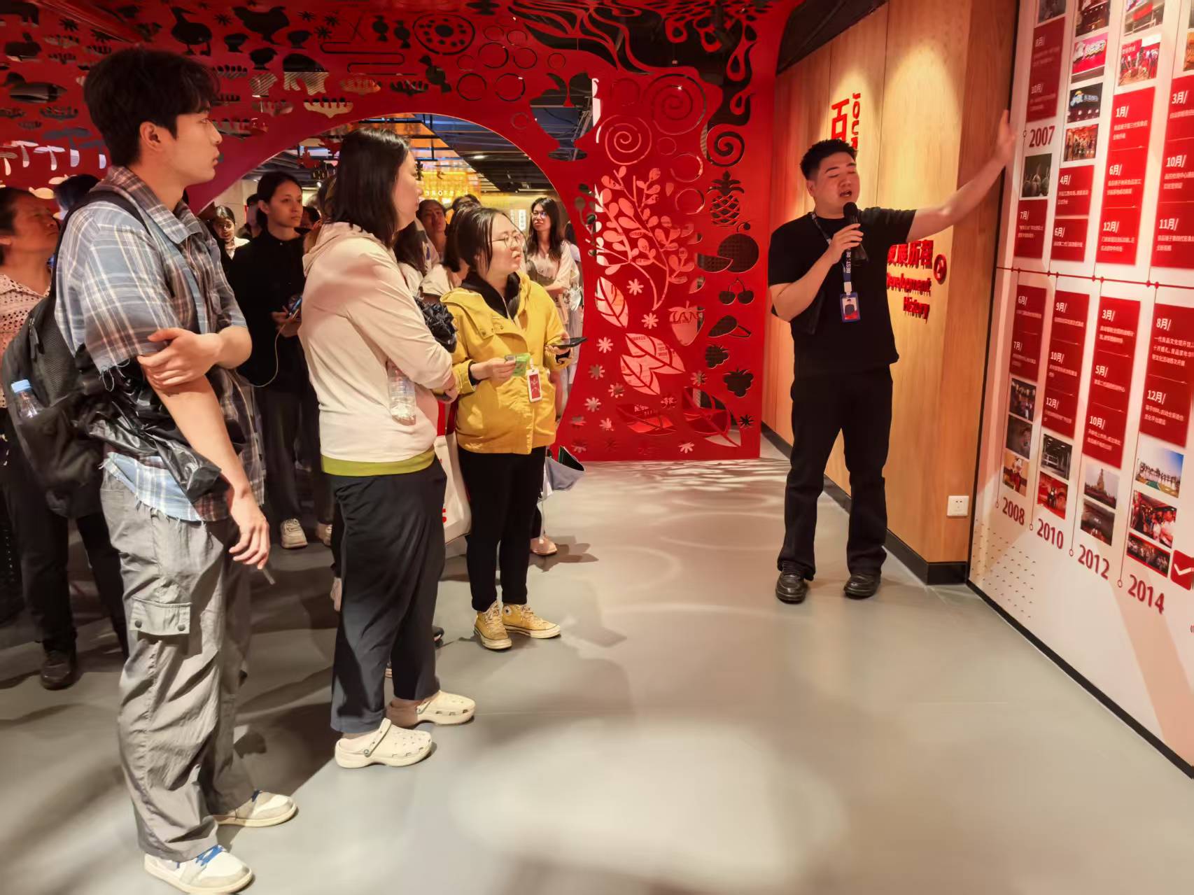 随后,师生一行前往良品铺子股份有限公司总部大楼,调研辖区重点民营企业党建工作。在良品铺子党委组织委员蒋英豪的引导和讲解下,大家详细了解了企业在推动党建与生产经营深度融合方面的具体做法与成效。良品铺子坚持“围绕发展抓党建,抓好党建促发展”的理念,积极探索非公企业党建新模式,通过构建党组织、工会与员工多方联动机制,切实提升了员工凝聚力与企业核心竞争力。企业党建不仅增强了企业的组织能力,同时增强了企业的社会效益,企业党建与现代企业治理的有机结合,给实践教学团队留下了深刻印象。