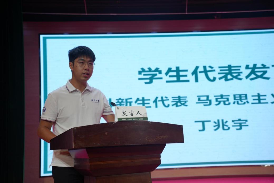在学生代表发言环节,本科新生代表丁兆宇同学分享了入学以来的深切体会。通过总结参加军训和观看抗战胜利80周年纪念活动的经历,他传达出自身对青年使命的认识。在回顾选择武大马院的初心时,他追溯了学校在马克思主义传播史上的重要贡献:从中共一大上的武大身影,到西迁乐山的文化坚守;从李达先生创建马列主义教研室,到陶德麟先生发出“实事求是”的时代强音。这些历史印记塑造了马院人“坚持真理、崇尚学术、服务社会、追求卓越”的独特品格。面对新时代,他呼吁同学们既要铭记“自强弘毅、求是拓新”的校训,德业并进;又要读好“有字之书”与“无字之书”,努力成长为“坐下去能写,站起来能说,走出去能干”的合格武大马院人,用奋斗书写无愧于时代的青春华章。