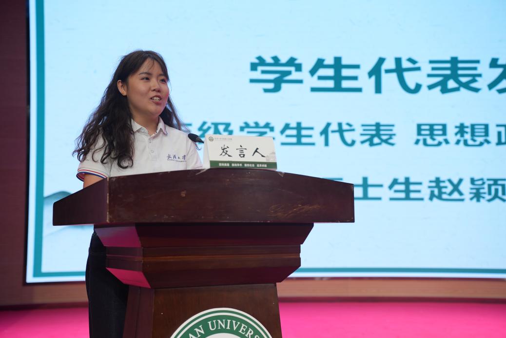 在校研究生代表2024级硕士研究生赵颖闻以“温度、深度、高度”为关键词,分享了在马院的成长感悟。赵颖闻表示,马院的“温度”体现在对学子的人文关怀中,让学子倍感温暖;“深度”源于顶尖的学科资源与多元实践平台,助力学术探索;“高度”则是学院培育担当民族复兴大任时代新人的责任担当。她鼓励新生以“马院人”身份,练就专业视野、扛起责任,让青春在奉献中绽放光彩,传递出武大马院学子的使命与担当。