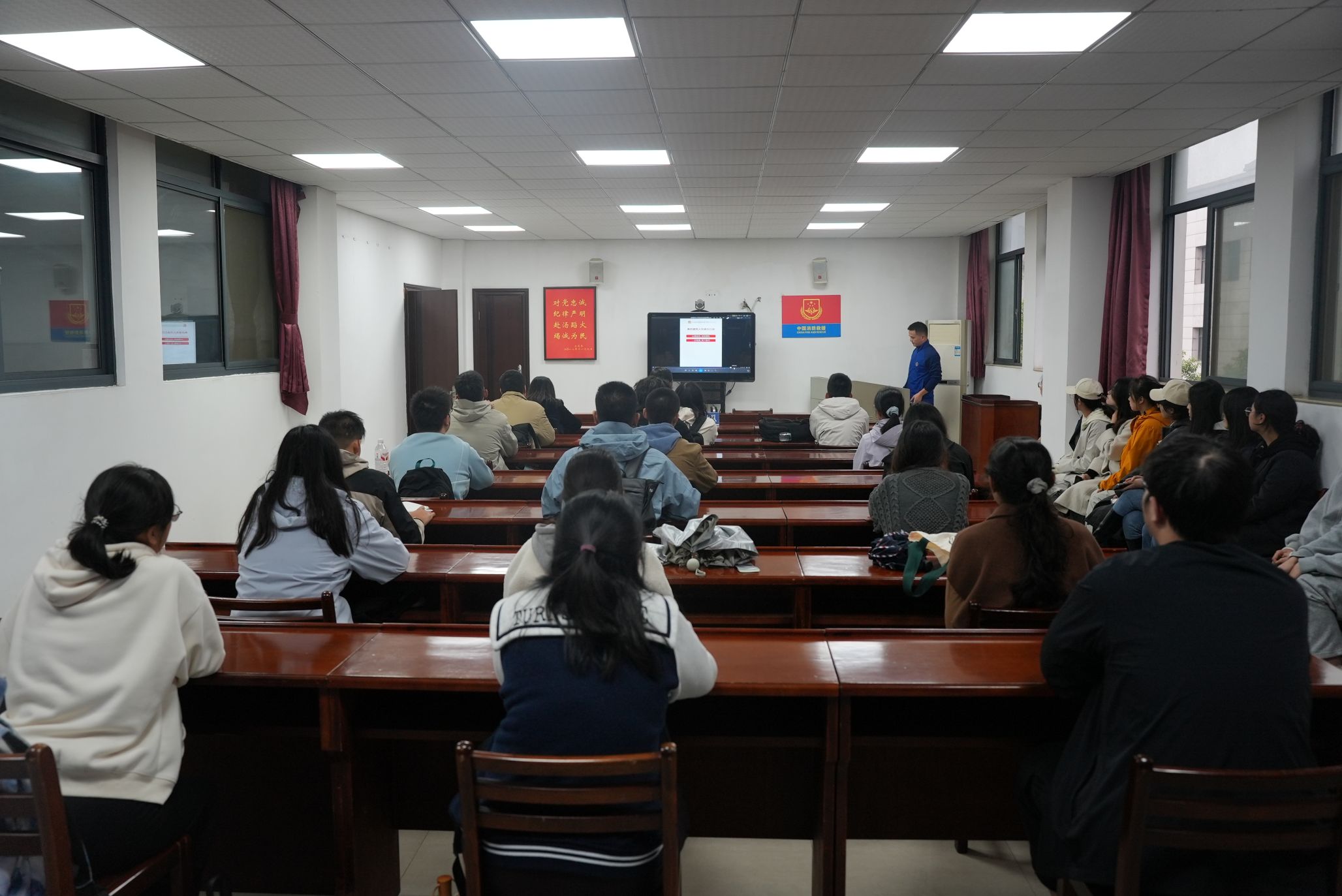 最后,全体师生在会议室集中参加了消防安全培训课。指导员结合高校和社区特点,系统讲解了火灾预防、火场逃生、报警注意事项等知识,并通过真实案例剖析,强调了增强防火意识、掌握自救技能的必要性。现场互动积极,气氛热烈,师生们纷纷表示受益匪浅。