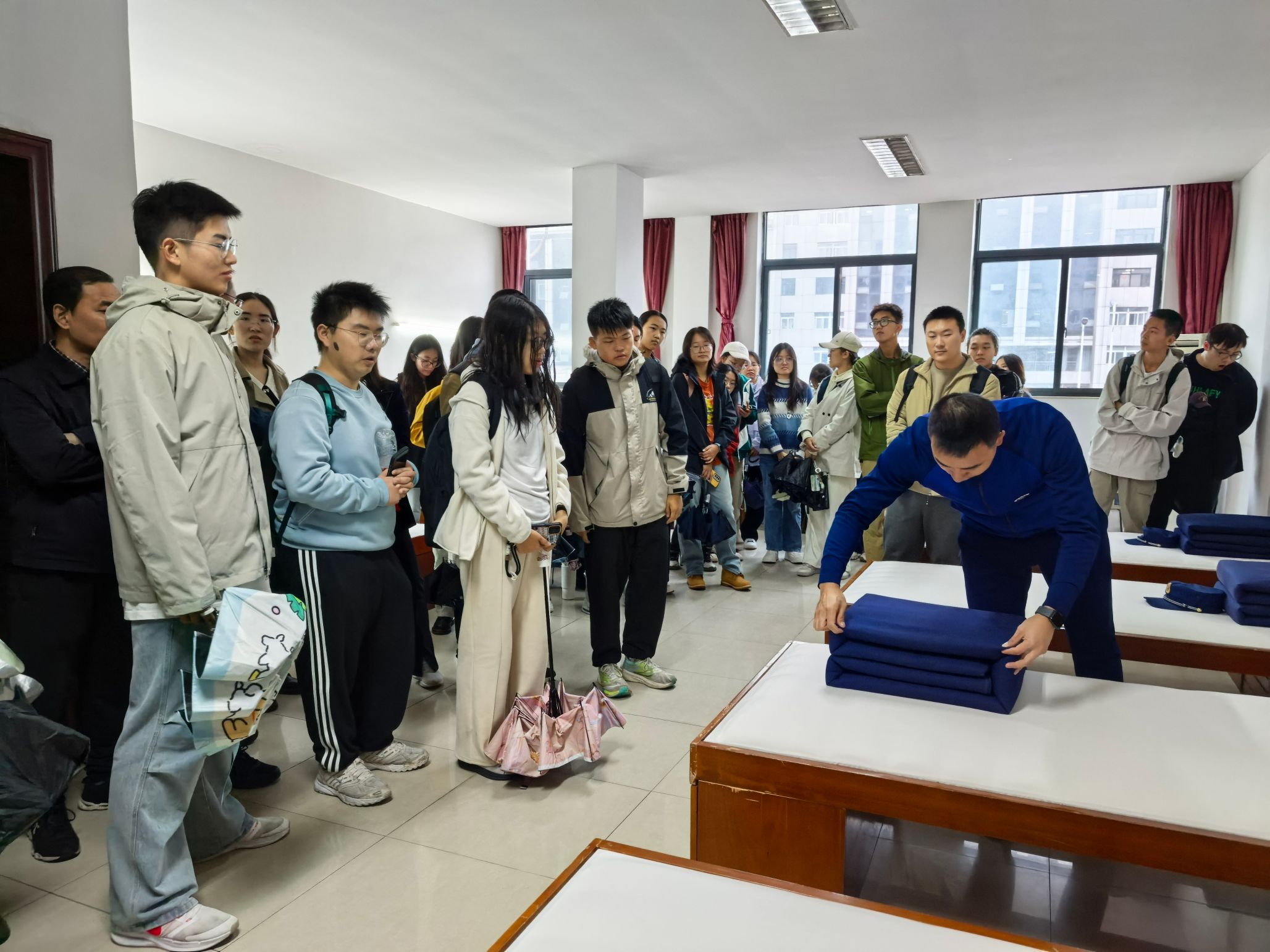 在内务展示环节,指导员带领师生走进消防员宿舍。整齐划一的物品摆放、干净整洁的环境,尤其是叠放如“豆腐块”般的被子,展现了消防队伍严谨的作风和良好的精神风貌。这一细节让师生们深受触动,对纪律建设和内务管理的重要性有了更直观的理解。
