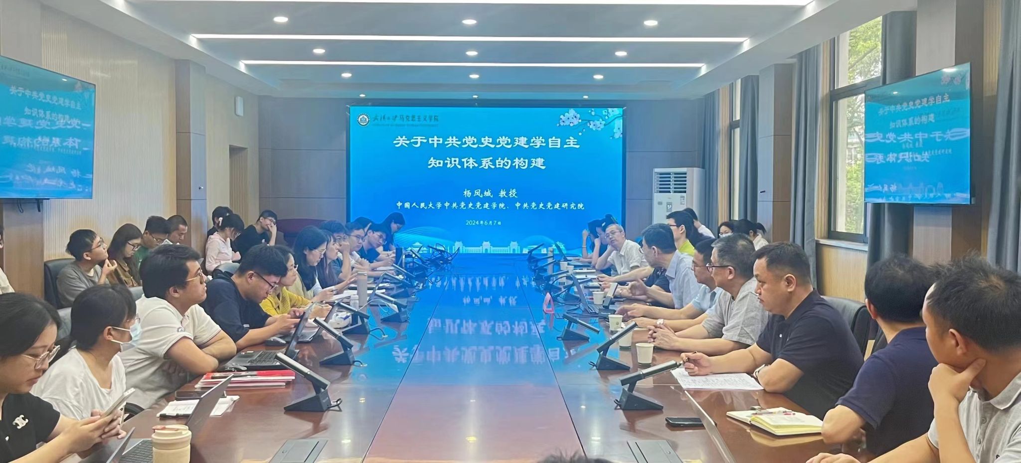杨凤城教授结合自己的研究专长和研究成果,主要从四个方面系统讲授了中共党史党建学自主知识体系的建构。一是中共党史党建学科体系的建构。具体包括中共党史党建学理论、中国共产党历史、党的领导和党的建设、党务工作理论与实践4个二级学科的建构。他强调,中共党史党建学科体系的建构具有很强的政治性,要坚持以习近平总书记关于党的历史重要论述和关于党的建设重要思想为理论指导,确保学科建构的方向正确。二是中共党史党建学术体系的建构。他指出,学术体系特别是中共党史党建学理论知识体系的建构,是中共党史党建学自主知识体系建构的关键环节,其在内容上应当囊括马克思主义及其中国化的理论成果、中共中央和党的领袖关于党史党建的重要论述、中共党史党建学的方法论、中国共产党历史、党自身建设和党的领导与执政的基本原理等知识体系的建构。三是中共党史党建话语体系的建构。他认为,话语体系是知识体系的外在表达,要厘清中共党史党建话语体系与其理论体系的联系与区别,加强对话语国内国际贯通传播的研究,着力打造融通中外的新概念新范畴新表述。四是中共党史党建学科手册的编纂。他提出,汇编包含中共党史党建学基本原理、已有成果、学术规范、拓展空间等的学科手册,是中共党史党建学自主知识体系建构在实践方面的一项重要任务。讲座最后,杨凤城教授以他近期从现代化视角认知传统文化的研究为例,鼓励青年教师及学子要强化时代站位、树立问题意识并开展有组织科研,以作出具有一定学术影响力的高水平研究成果,共同致力于建优建强中共党史党建学学科。