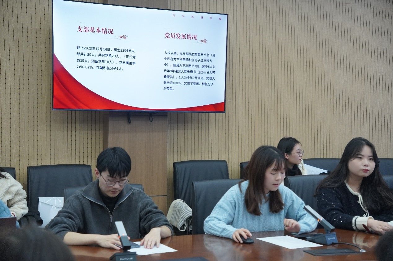 硕2204党支部书记杜慧子则对提升支部活动参与度的具体工作经验进行了分享。杜慧子同志认为支部活动具有全员参与、党团共建、联合共建、线上线下相结合的特点,通过展示具有支部特色的政治生日会、主题教育等“三会一课”组织形式,指出支部共建活动对于提高党员身份认同感的重要作用,并且分享了自己在支部建设中对活动策划的撰写、宣传投稿的心得感受。