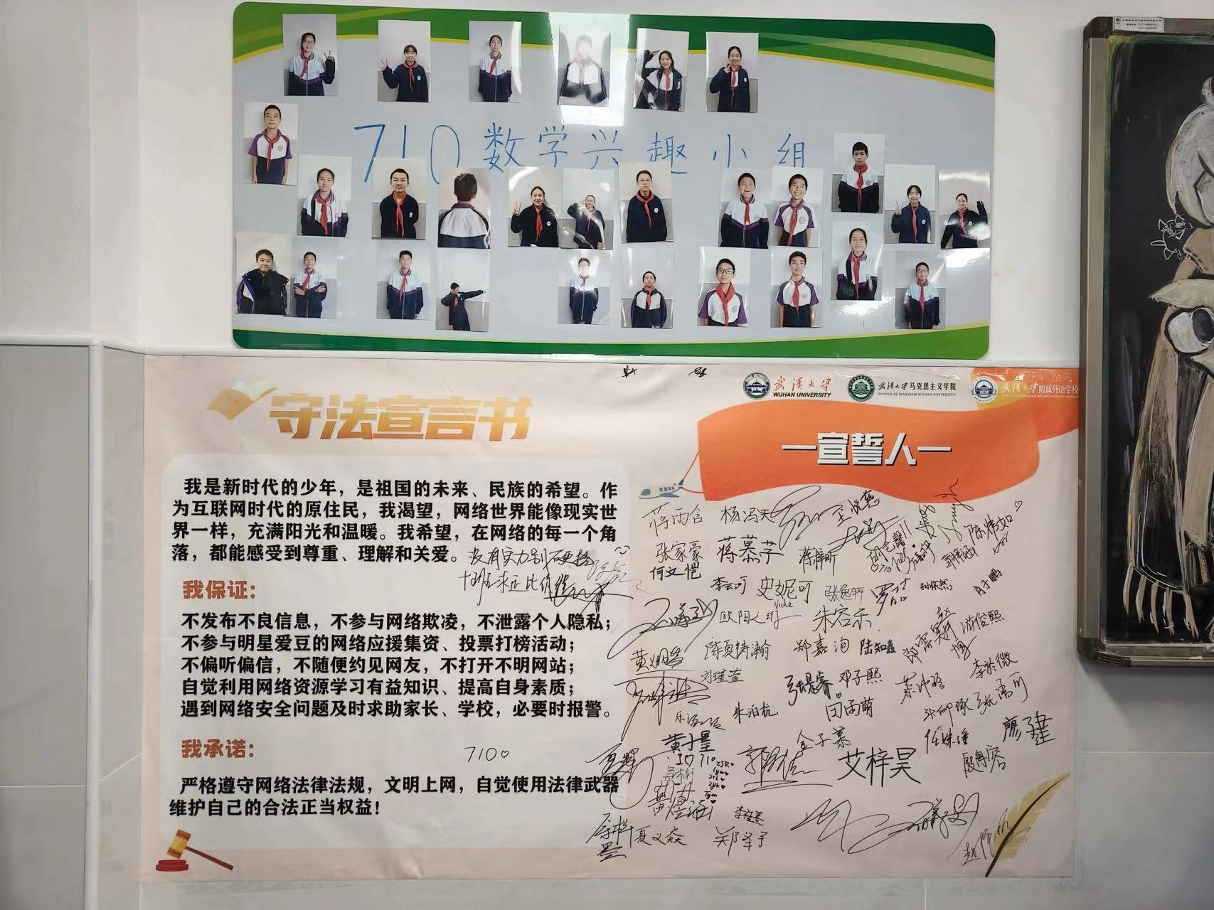 主题活动的第三环节是共同签署守法宣言书,领取印有《条例》第26条、第45条的书签。同学们依次上台在守法宣言书上郑重签上了自己的名字,班主任王荟老师带领同学们将这份宣言书悬挂在班级醒目的一角,时刻提醒同学们做一名懂法、守法的中学生。至此,活动圆满结束。