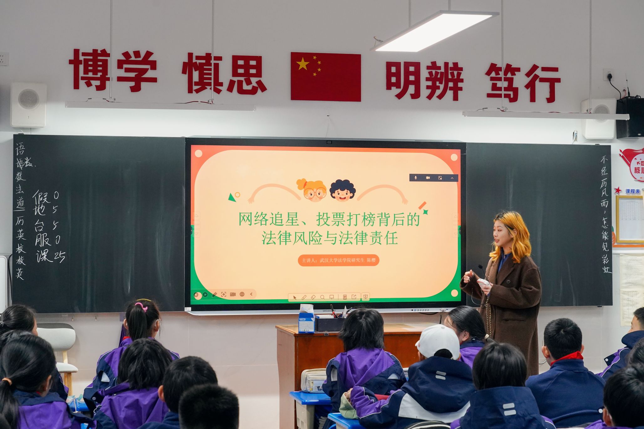 陈樱同学说:在这次普法宣传活动中,虽然上课时间短暂,但我深刻体会到了同学们渴求知识的活力与热情。本次课程中,我们将法律知识与同学们日常生活紧密结合,用实际案例和同学们分享了参与投票打榜此类的追星活动可能面临的法律责任与法律风险,不仅增强了他们的法律意识,还培养了他们学以致用的能力。这种改革创新的教学方式,让同学们在实践中学习法律,理解法律,运用法律,同时又有效地提升了思政课的吸引力和实效性,我很荣幸能够参与此次活动。