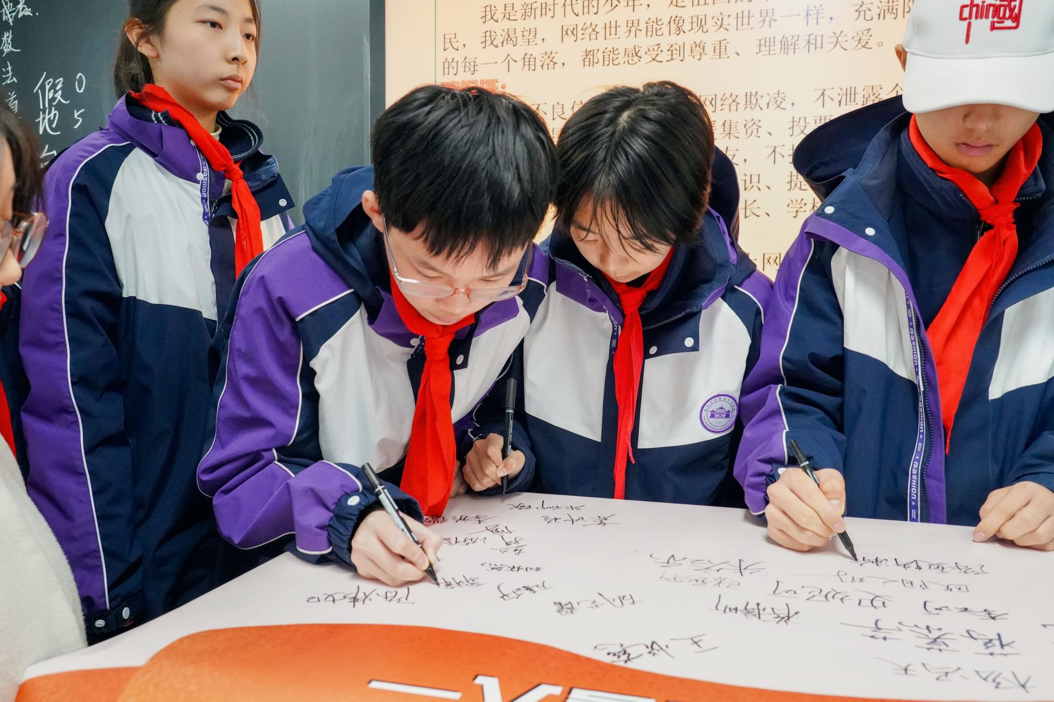 活动的第二环节由七年级10班蒋慕芓同学带领大家共同宣读由研究生同学起草的网络行为“守法宣言书”,共同承诺不参与网络欺凌和明星爱豆的网络应援集资、投票打榜活动,严格遵守网络法律法规,自觉使用法律武器维护自己的合法正当权益。