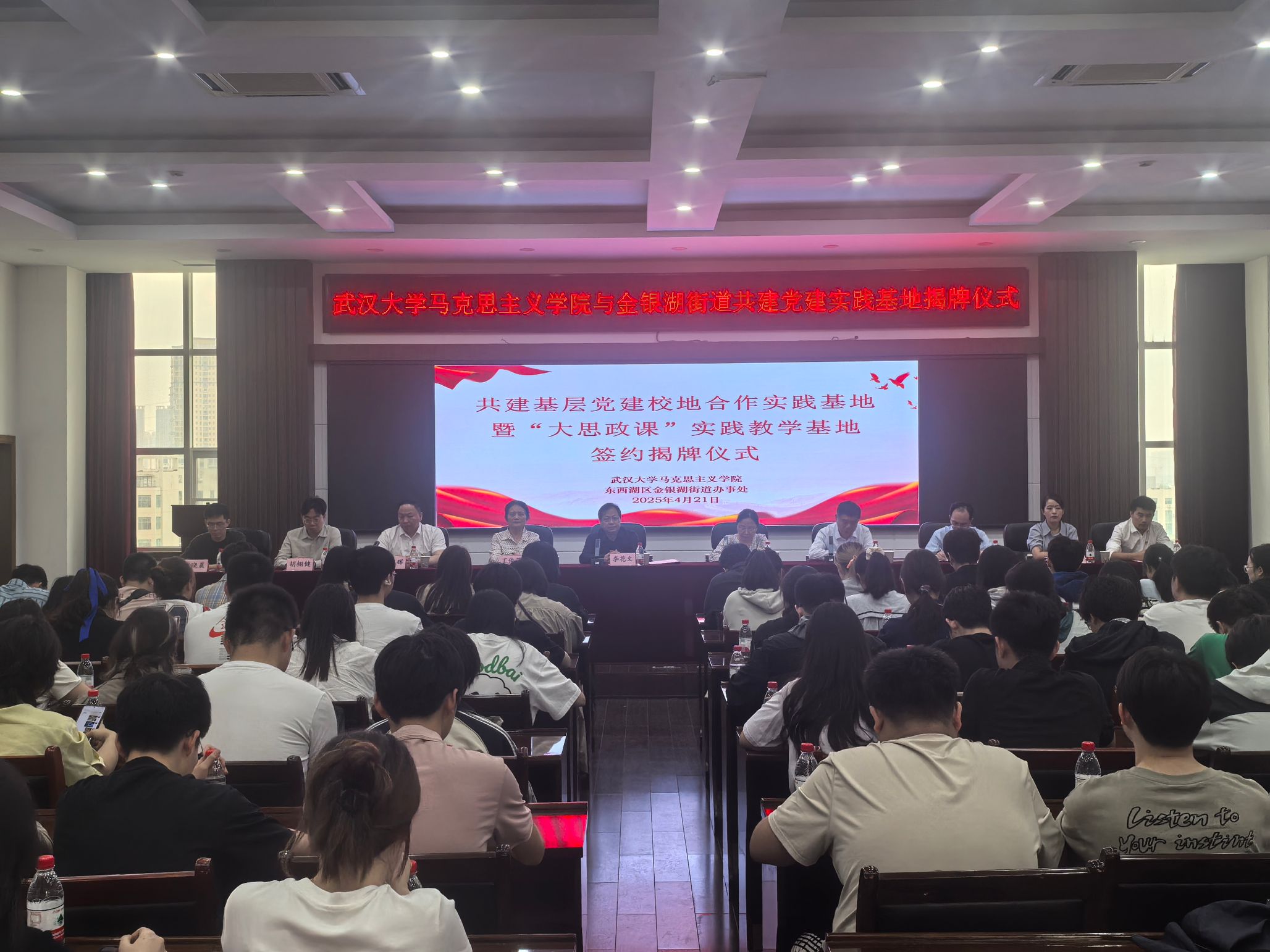 实践教学行程最后,师生们来到金银湖街道办事处701会议室,参加“基层党建校地合作实践基地”揭牌仪式。来自区委组织部、区委直属机关工委等单位的领导参与本次授牌仪式。仪式由街道党工委副书记赵国辉主持,AI风月