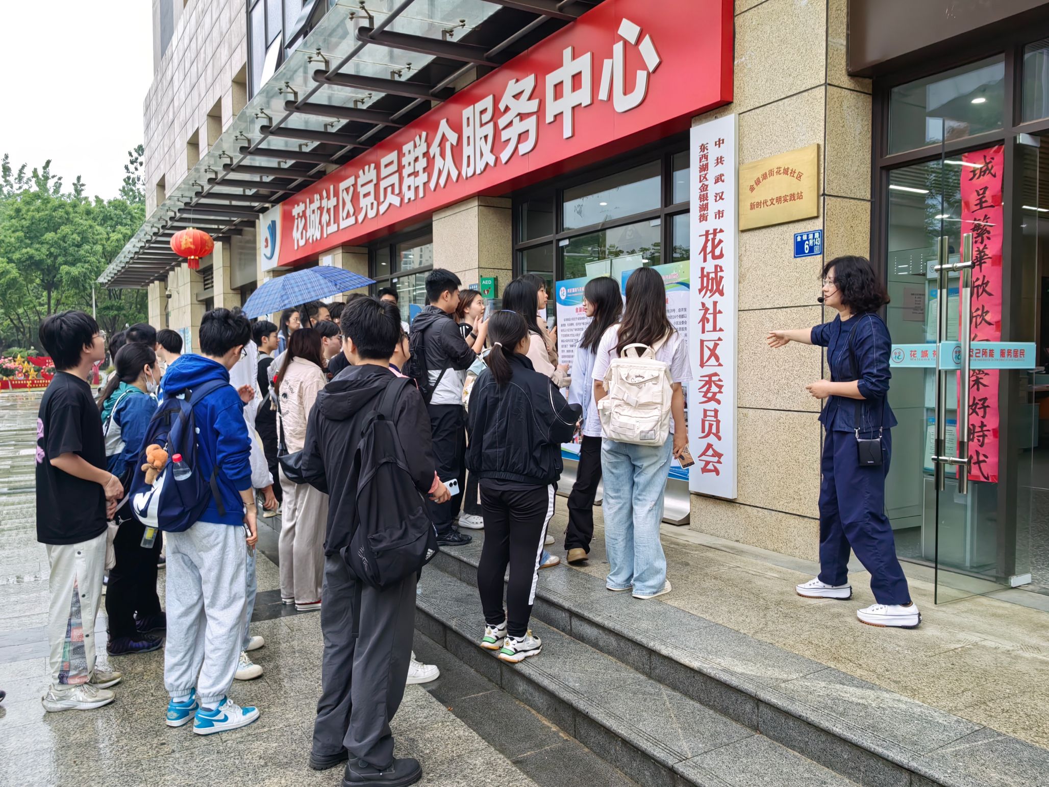 活动首站,实践教学团队一行抵达金银湖街道花城社区,参观了社区党群服务中心及“金畔花园”商圈暖“新”驿站。在花城社区党委书记、居委会主任魏彦辉的讲解下,大家深入了解了社区党建、商圈党建及面向新业态新就业群体的党建探索与创新实践。特别是在暖“新”驿站中,社区通过设立休息区、提供饮水、充电、政策咨询等贴心服务,为快递员、外卖骑手等新就业群体打造了一个“暖心港湾”,不仅增强了他们的归属感,也让大家看到了党建工作如何以实际行动回应群众需求、温暖基层一线。现场展示的“红色阵地”建设、社区服务机制和党建引领下的新就业群体凝聚路径,引发了师生们对基层治理方式和“大思政课”育人路径的深入思考。