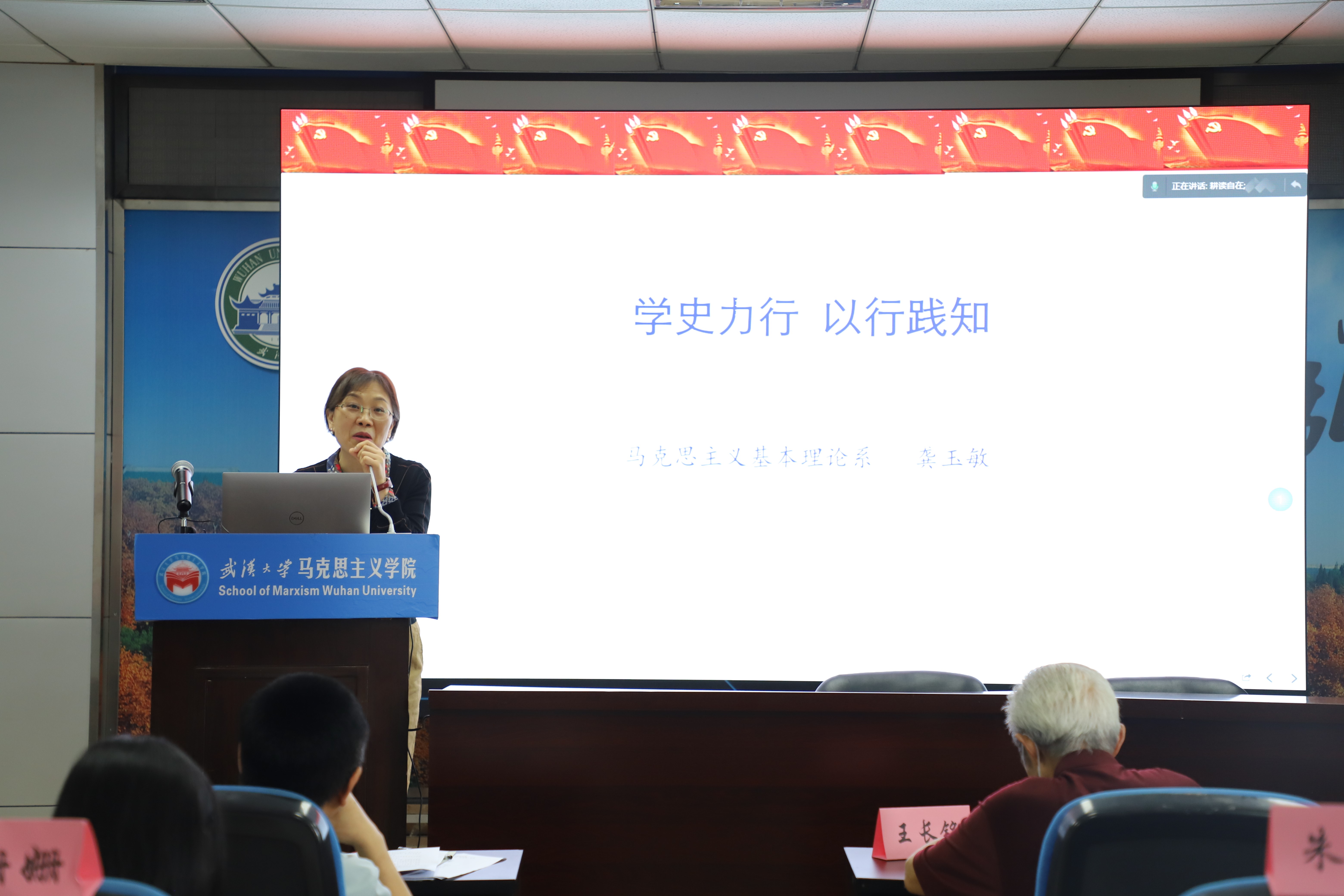 马克思主义基本理论系教师党支部书记龚玉敏副教授以“学史力行 以行践知”为主题,阐述了新时代青年学子和教师的重要任务及中国共产党在实践中取得的规律性认知和理论成果。龚玉敏在讲课中指出:实干就是力行,思政课教师应将立德树人作为力行目标。学党史以明理,百年党史中的理包括对中国共产党对三大规律的探索和认识,社会主义建设规律就包括建设理念、发展战略、发展动力等在内的规律性认识,并取得了邓小平理论、“三个代表”重要思想、科学发展观以及习近平新时代中国特色社会主义思想概论等伟大理论成果。从“学史力行”“以行践知”中,她得出的启示是:新时代的高校思政课教师要以明理为始,明确力行目标,积极探索教学经验。
