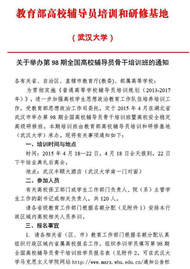 关于举办第98期全国高校辅导员骨干培训班的通知